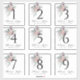 Individual wedding table number sticker labels for wine bottles or champagne favour centerpieces with personalized bride and groom or partner couple's name and wedding date and a beautiful boho floral of eucalyptus and muted blush pink, rose gold, plum purple, and burgundy flower bouquet.