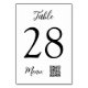 Elegant table cards in black and white with a clean and minimal design and a QR code to access the wedding menu online.