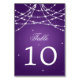 Design élégant "Numéro de table" de mariage avec Sparkling String Purple et texte de numéro de table personnalisé.