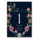 Numéro de tableau des Mariages Fleurs sauvages bleus de la Marine. Ce numéro de table de mariage élégant et élégant est orné de magnifiques Fleurs sauvages d'aquarelle peints à la main. Trouvez les objets correspondants dans la collection de rêves Fleurs sauvages bleu marine.