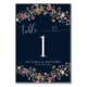 Numéro de tableau des Mariages Fleurs sauvages bleus de la Marine. Ce numéro de table de mariage élégant et élégant est orné de magnifiques Fleurs sauvages d'aquarelle peints à la main. Trouvez les objets correspondants dans la collection de rêves Fleurs sauvages bleu marine.