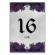 Numéro de table violet foncé et argenté avec conception laiteuse florale noire. Changez le numéro de table, individuellement et ajoutez au panier selon vos besoins sur cette carte de numéro de table pour compléter votre événement. Jeu de faire-part de mariage correspondant disponible.