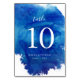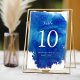 Cartes de numéro de table de mariage imprimées sur mesure avec un arrière - plan d'aquarelle bleu abstrait pour coordonner avec notre collection Sapphire Tide. Veuillez personnaliser chaque numéro dont vous avez besoin et ajouter chacun à votre panier individuellement pour assurer une impression précise. Utilisez les outils de conception pour éditer les polices de texte et les couleurs ou télécharger vos propres photos pour créer une conception unique d'un genre. Ce design d'inspiration océanique est parfait pour un mariage de destination sur la plage !
