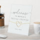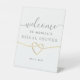 Elégante, simple Fête des mariées blanche Signal de piédestal de bienvenue avec un coeur de corde en or faux et script de calligraphie moderne.