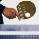 A cool table-tennis-paddle with a stylish distressed brown background, to personalize with your own name and initials.