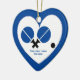 Table tennis ping-pong rackets and ball black and blue heart shape ceramic ornament displaying a minimalist pictogram icon of blue and black table tennis rackets and ball and your text on white background with blue border.