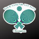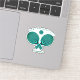 Retro style design of two table tennis rackets and a ping pong ball in turquoise green with a hypnotic pattern on a yellow background for ping pong lovers and tabletennis players.