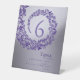 This wedding table number card is designed with an elegant and decorative ornate frame made from intricate damask patterns in shades of purple and lavender. The swirling damask design forms a circular border, gracefully enclosing the large table number in the centre. The typography balances modern clarity with a touch of refinement, while the word “Table” is styled in flowing script to enhance the romantic and formal look.
