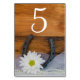 Ajoutez une touche de charme à la décoration de votre ferme rurale ou de style ranch de la douche nuptiale ou réception mariage avec la décontractée mais classe White Daisy et Horseshoe Pays Western Mariage Numéro de table. Ces cartes de numéro de table à thème équine chic rustique sont dotées d'une photographie florale surannée d'une fleur de marguerite blanche, d'un fer à cheval rouillé, d'un collier de perle et d'un voile de mariée blanc avec un arrière - plan de bois patiné brun.