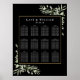 Ce tableau de placement avec feuilles de eucalyptus élégantes présente des feuilles délicates à l'aquarelle avec le plan de placement de vos invités encadré par une bordure dorée sur fond noir avec une typographie blanche moderne. Conçu par Thisisnotme©