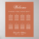 Un simple tableau de sièges avec 8 tables, pour un mariage avec couleur mariage en terre cuite. L'arrière - plan est en terre cuite brun, le texte est blanc. Le mot Bienvenue dans la partie supérieure et les noms de la mariée et du marié sont écrits dans un élégant script calligraphique, le reste en casquette.