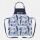 Ara Parrot bleu et rose Motif de feuille tropicale nom Apron. Motif bleu sur bleu foncé arrière - plan avec des feuilles tropicaux. Ajoutez votre nom ou effacez-le.