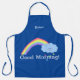 C'est un tablier bleu royal à porter le matin, qui peut être personnalisé avec votre nom. Il est décoré d'une simple image d'arc-en-ciel avec un nuage et des gouttes de pluie tombant sur les mots "Bonjour !", en lettres blanches. Il se présente dans un choix de trois tailles, petites, moyennes et grandes.