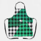 Ce tablier a un design moderne du milieu du siècle de diamants noirs solides à l'intérieur des contours de diamants noirs avec des triangles dans les nuances de vert de mer sous eux, le tout sur un champ de blanc.
