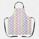 Ce tablier est décoré dans un style art déco avec des demi-cercles orange, turquoise, rose, bleu, violet et jaune reliés à des lignes sur un champ de blanc.