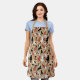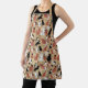 Apron dans une variété de chats mignons et stylisés dans diverses poses, couleurs et motifs ludiques - tabby, noir, blanc, et calico - ensemble contre un arrière - plan bronzé. Des feuillages épars et de minuscules coeurs ajoutent des accents ludiques au design.