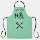 Apron tendance pour le nouveau hubby. Parfait comme cadeau. Conception avec script de calligraphie "Mr", chef cuisinier et appareils de cuisine. Personnalisez avec un nom et une année établis.