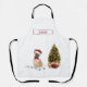 Un sapin de Noël décoré est entouré de cadeaux et d'un bas rouge. Un mignon Bulldog français porte un chapeau santa et une cravate d'arc. Le chien laissa des empreintes de pattes boueux autour. Envoyez ce cadeau pour les vacances !