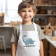 This kids' apron features a cute illustration of a grayish blue dinosaur. Personalize it with your child's name in black letters.
