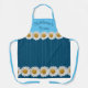 Un joli tablier fleuri dans deux tons de bleu, décoré de rangées de marguerites blanches à la taille et à proximité de l'ourlet, et de fines rayures. Le texte dit "(nom personnalisé)'s Kitchen".