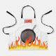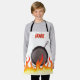 tablier de cuisine pour garçons ou filles avec une bordure feu ou flammes avec poêle en fonte ou poêle, personnalisé avec le nom de votre enfant et le choix de couleur arrière - plan, parfait pour vos petits aides à la cuisine.