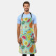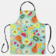 Cet article est un tablier avec un arrière - plan vert clair. Il possède des sangles noires et le tablier est décoré avec des fruits et des légumes.