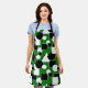 Ce tablier a une conception Bauhaus de triangles, cercles, rectangles et pentagons en noir et blanc sur un champ de vert.