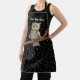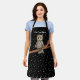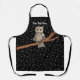 Ce tablier de cuisine est noir avec des étoiles blanches et une chouette brune aux yeux jaunes dorés portant un collier bleu assis sur une branche d'arbre. Customisez votre texte avec le modèle.
