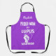 C'est un LUPUS WARRIOR Fête des Mères Fier Maman Apron en PURPLE avec un TEXTE PERSONNALISABLE pour montrer votre soutien en tant que mère fière d'un être cher qui traverse cette maladie. La conception montre un poing blanc surélevé s'accrochant sur un ruban lilas avec un contour cardiaque dans l'arrière - plan. Cela représente montrer de la solidarité et de la force à vos proches ou amis qui luttent contre la maladie. Le TEXTE PERSONNALISABLE en haut peut être PERSONNALISÉ avec votre nom. Un grand cadeau pour la fête des mères ou pour l'anniversaire de maman pour montrer votre soutien en tant que maman, ou votre reconnaissance pour votre mpm. Aussi en blanc et noir.