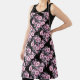 Ce graphique floral, est présenté dans un motif de diamant, avec des grappes de fleurs, pétales et feuilles, en teintes muettes de ; rose, fuschia, lavande, mauve, vert et blanc sur fond de noir.