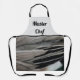 Une photo de plumes de canard orne ce tablier "Master Chef" créant des bandes horizontales de plumes. Les plumes d'oiseaux noirs et gris apportent une touche de nature et un élément abstrait unique à cet espace moderne, parfait pour le chef cuisinier ou boulanger de votre famille. Tout le texte peut être facilement customisé si désiré.