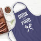 Le tablier parfait pour le type qui aime griller. Deux spatules croisées apparaissent en blanc sous les mots "Mec avec la nourriture" en blanc sur un arrière - plan bleu marine. Fait un cadeau idéal d'anniversaire ou de Fête des pères.