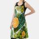 L’image présente une mélodie radiante de feuilles de Monstera et de palmiers vertes, qui se combinent avec des tranches d’oranges juteuses et des fruits exotiques dans le jaune luisant et l’orange. Le contraste vivant sur un fond clair donne une chaleur joyeuse, tropicale, qui émet de l'énergie et une lueur de paradis.
