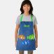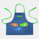 Tabliers de cuisine pour garçons ou filles avec un design sous la mer. Fond d'eau bleu avec trois poissons clowns et nom de l'enfant en vert clair en haut. Des poissons rayés orange, bleu et vert nagent sur ce tablier amusant pour les enfants qui aiment cuisiner et faire de la pâtisserie.