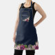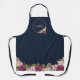Joli tablier fleuri en bleu foncé avec son monogramme imprimé sur la poitrine : votre initiale en bleu et votre nom en rose vif à l'intérieur d'un cadre géométrique imprimé avec un effet faux or. L'ourlet du tablier est imprimé de fleurs roses et prunes rousses et de verdure.