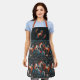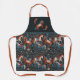 Ce tablier unique est composé d'un motif de trois chevaux nordiques, d'un de couleur crème, d'un bleu et d'un brun à la cannelle. Les illustrations de fleurs et de feuilles dans les couleurs correspondantes sont éparpillées dans le motif. La partie supérieure est constituée d'un solide assorti au bleu foncé, avec une seule image du cheval brun cannelle et des images de branches de feuilles assorties.