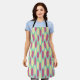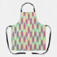 Ce tablier a une conception géométrique de fait d'un arrière - plan de rectangles vert mer et bleu clair avec des ovales jaunes et roses sur le dessus.