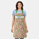 Gingerbread cookies in the shape of people, mittens, houses, candy canes and more decorate the background of this apron. There is a white box with green borders and inside that box you can add your personalization. Change the name, the words