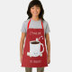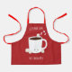 Un tablier rouge qui présente une tasse souriante de cacao chaud avec un sucre de canne et plusieurs guimauves joyeuses. Le tablier contient les mots "Ayons du chocolat chaud !" en lettres blanches et ces mots peuvent être customisés.