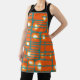 Ce tablier a un design moderne du milieu du siècle de rectangles oranges avec des cercles blancs et dorés et des lignes horizontales turquoises les traversant sur un champ de turquoise.