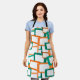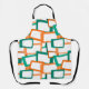 Ce tablier présente un design moderne du milieu du siècle, composé de rectangles déchiquetés avec des trous blancs dans les tons turquoises et orange.