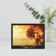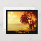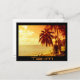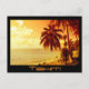 Postcard with an orange sunset on a beach with palm trees on the tropical island of Tahiti in the archipelago French Polynesia in the Pacific Ocean with a black border and the text: 'Tahiti'.