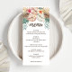 Tropical island inspired wedding menu features an arrangement of hibiscus, flamingo and jasmine flowers, and palm leaves with your wedding menu options and names. The reverse side is an abstract fan palm leaf in shades of khaki beige and taupe. Perfect for beach, destination and tropical themes.