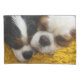 C'est une taie d'oreiller de taille standard comportant une photographie originale de deux épagneuls cavaliers adorables du Roi Charles, un tricolore et d'un blenheim, dormant ensemble sur leur couverture préférée.
