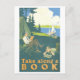 This postcard is a reproduction of a vintage library poster that reads, "Take along a book," showing a father and son outdoors at a campsite, with sailboats in the background.