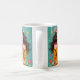 A sweet folk art style whimsical coffee cup with a self-love quote and an ai illustration of a girl hugging herself. A pretty picture with teal, pink and orange tones done in a whimsical cute style.