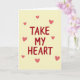 This card features the phrase “TAKE MY HEART” in deep cranberry red, written in a loose brush-letter style that feels honest and a little imperfect. The words sit large in the center, so the message is the first thing you notice. Behind it is a pale yellow background that looks like soft morning light and gives the whole card a gentle glow. Around the text are eight blush-pink hearts, scattered in different sizes like they’re lightly floating. The hearts are simple and rounded, adding a sweet touch without taking attention away from the message. It feels meaningful because it says what you might be shy to say out loud, in a direct and caring way 🥰. This is a lovely choice for a partner, a crush, or even a close friend you want to remind that you care ❤️. Hope it helps you share Valentine’s Day feelings with someone special.
