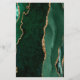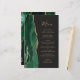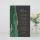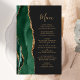The left-hand edge of this elegant modern wedding menu features an emerald green watercolor agate border trimmed with faux gold glitter. The customizable text combines whimsical gold-coloured handwriting script and copperplate fonts on a slate black background. The reverse side features a matching emerald green and gold agate design.