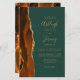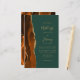 The left-hand edge of this elegant modern all-in-one budget wedding invitation features a burnt orange and rust watercolor agate border trimmed with gold faux glitter. The customizable text combines gold-coloured handwriting, copperplate and italic fonts on an emerald green background. The burnt orange agate design also appears on the back of the card.