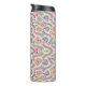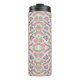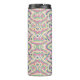 Tall, insulated travel mug with intricate, colorful geometric patterns in pink, blue, green, and yellow. Black lid contrasts with vibrant design.